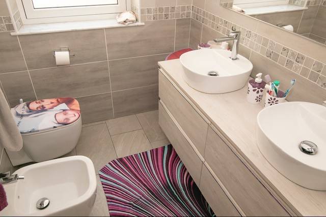 Al piano inferiore troviamo due ampie camere da letto, di cui una con accesso diretto a un grande terrazzo vivibile, un soggiorno con angolo cottura anch'esso affacciato sul terrazzo, un bagno con doppio lavabo e una comoda dispensa/lavanderia.