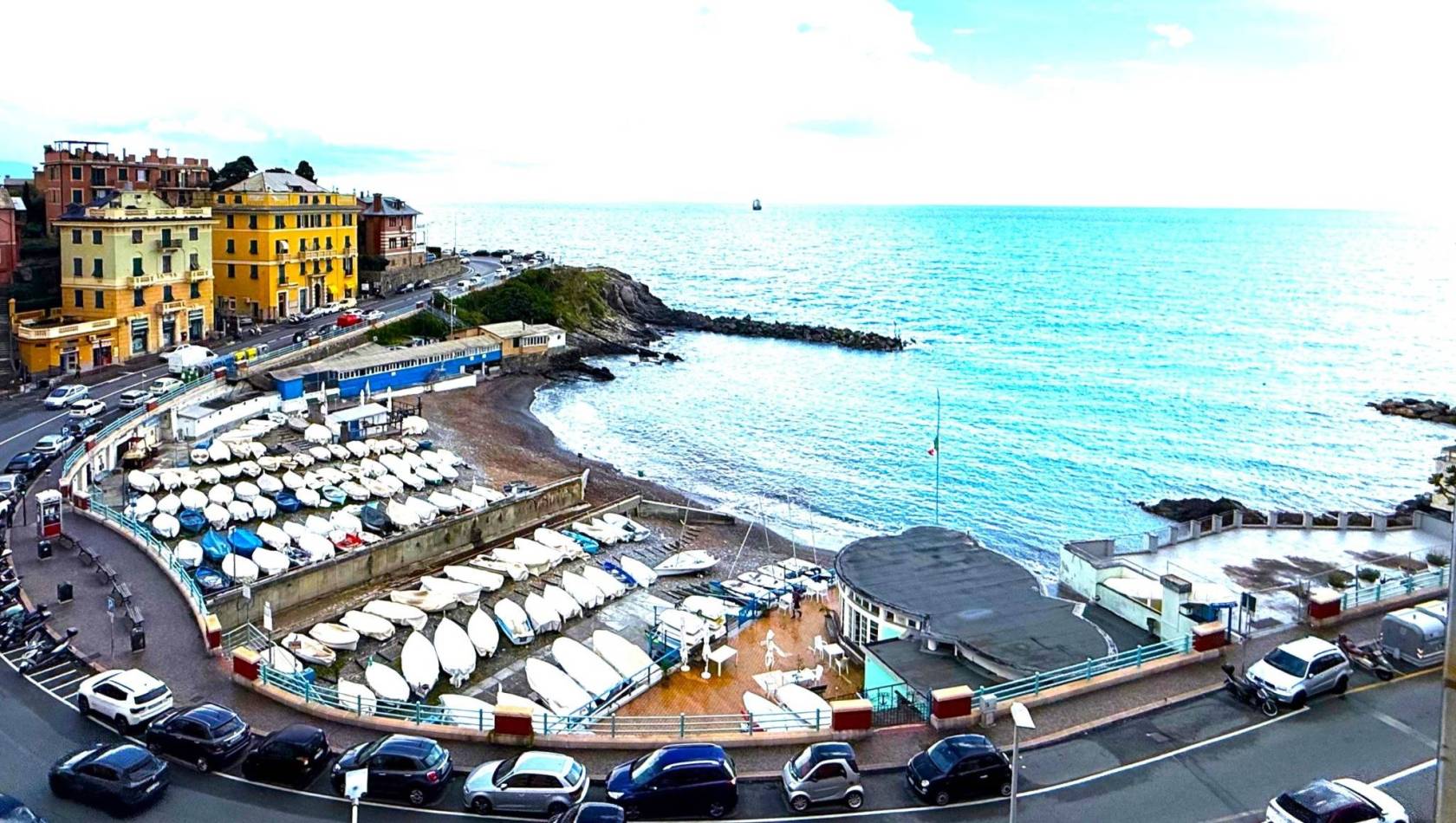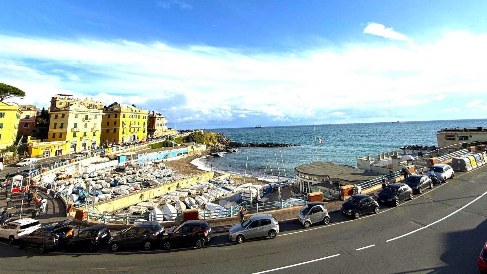 La posizione è semplicemente invidiabile: fronte mare, a due passi dalla spiaggia attrezzata di Priaruggia e dai principali servizi della zona, comodissimo alla stazione ferroviaria di Quarto, raggiungibile con accesso diretto pedonale direttamente dal contesto.